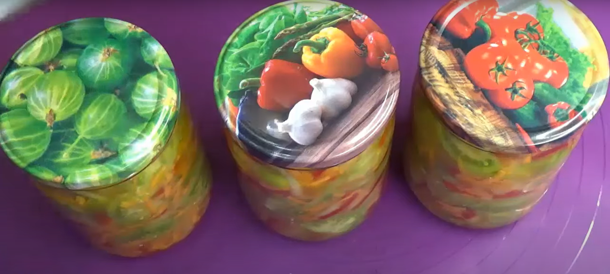 5. Наполнить стерилизованные полулитровые банки салатом, утрамбовывая так, чтобы жидкость покрывала овощи.