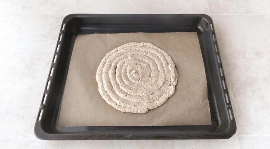 - Форма для выпечки: На листе пергамента нарисуйте два круга диаметром 22 см, переверните их вверх дном на противень. Отсадите тесто по спирали, посыпьте сахарной пудрой и оставьте на 10 минут, затем повторите процесс. Выпекайте коржи 20-23 минуты, после чего остудите их.