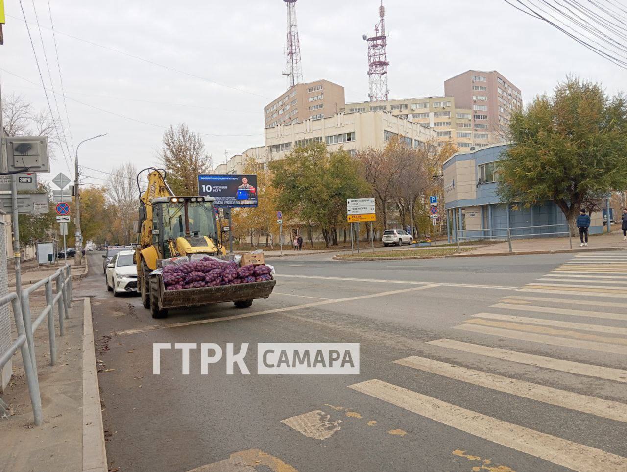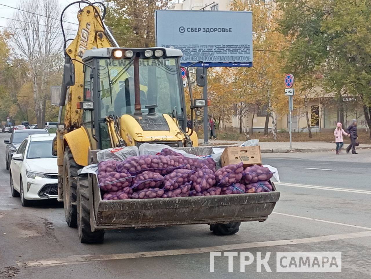 На улице Советской Армии наши подписчики обнаружили вот такую картину — огромная партия картофеля ехала к месту хранения в ковше трактора.
