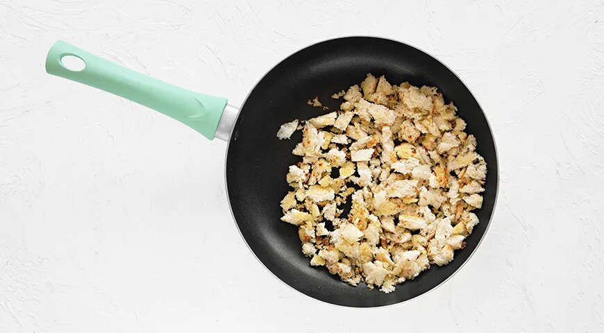 На нагретую сковороду наливаем оливковое масло и добавляем хлебные крошки, обжаривая их до золотистого цвета. В процессе можно приправить их солью и перцем. Готовые крошки оставляем в стороне.