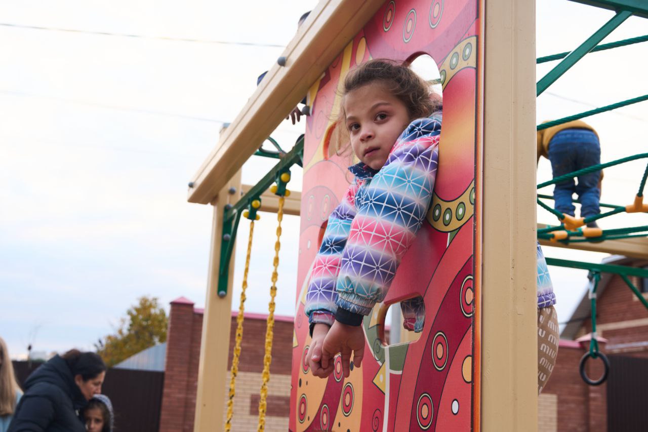 Несмотря на небольшие размеры площадки, здесь есть все необходимое для активного отдыха: качели, качалка на пружине и спортивный комплекс для развития ловкости и координации.