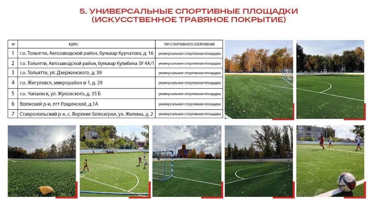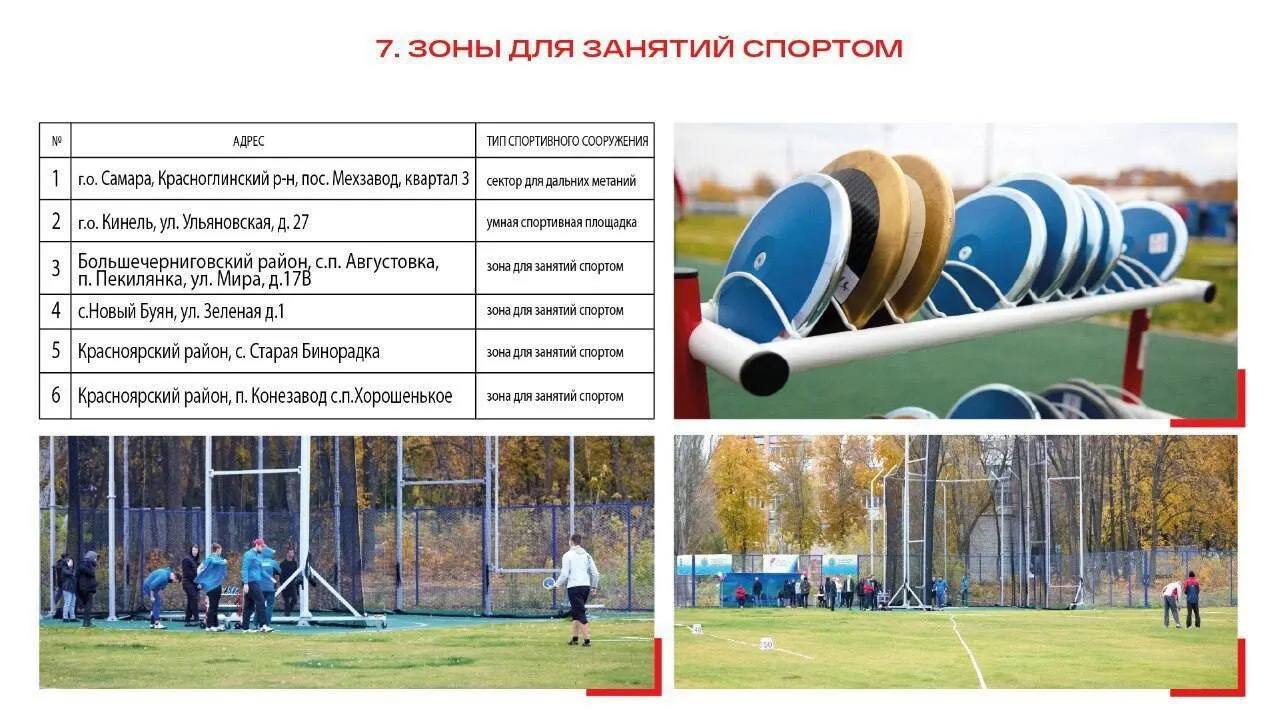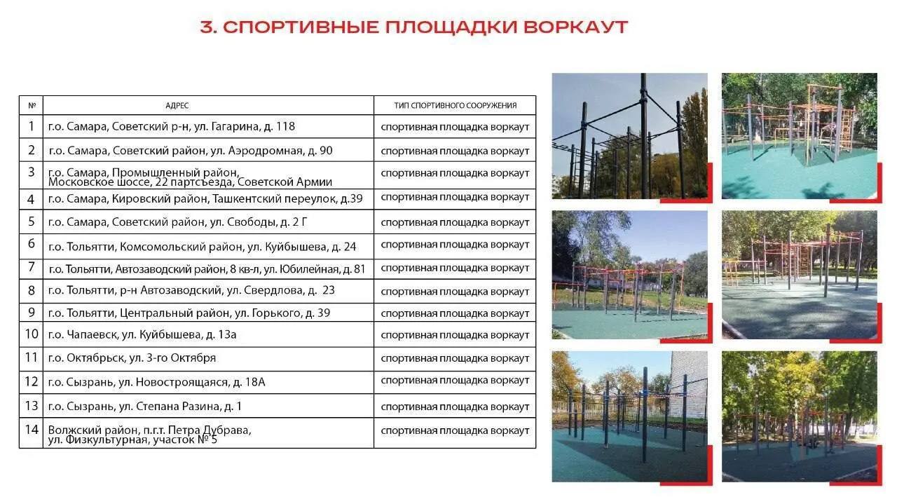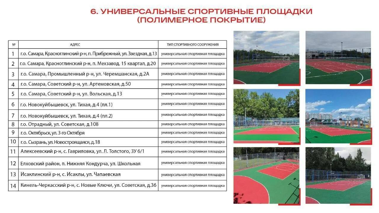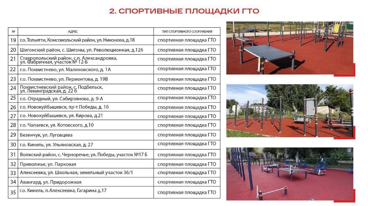«Это полноценные площадки для сдачи норм ГТО, мини-футбольные поля, полноценные универсальные площадки, «коробки» для игр в хоккей, а также площадки воркаута. Открываем мы их по мере готовности и ввода в эксплуатацию. По ряду адресов продолжаются работы, уверен уже в этом году жители Самарской области смогут опробовать эти объекты и получат возможность заниматься физкультурой в шаговой доступности от дома»,