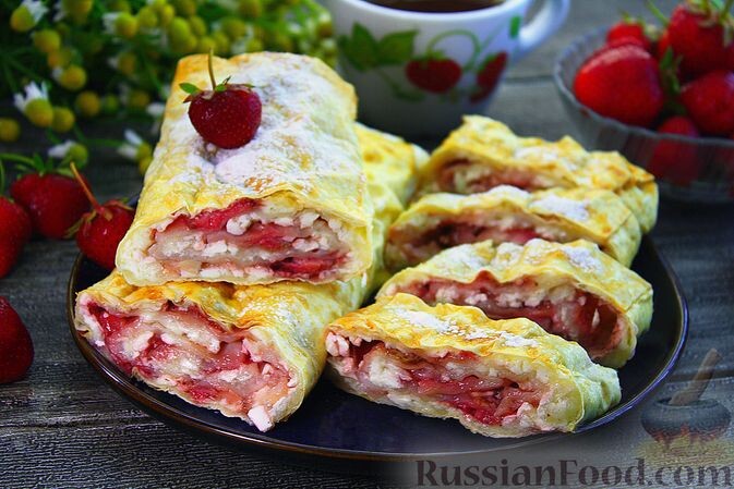 - Рулет из лаваша с творожной начинкой и клубникой: Хрустящий лаваш, наполненный нежным творогом и спелой клубникой, запеченный до золотистой корочки. Идеальное дополнение к чаю или кофе.