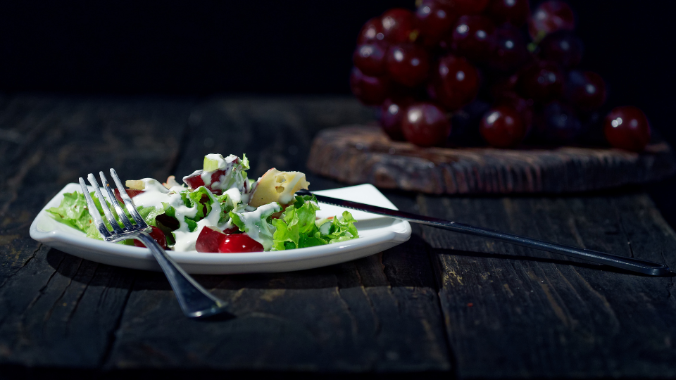 - Ингредиенты: свежий зеленый салат, одно зеленое яблоко, 250 г винограда, 5 фиников, 100 г грецких орехов, 100 г сыра (например, пармезан), легкий майонез, обезжиренный йогурт, сок и цедра одного апельсина, со специями по вкусу.