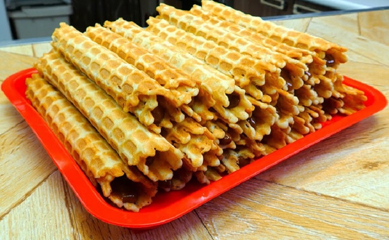 Разогреть вафельницу и смазать ее растительным маслом. Вылить порцию теста на центр рабочей поверхности и выпекать 1–2 минуты до золотистого цвета. Горячие вафли легко сворачиваются в трубочки или конусы. Если дать им остыть в развернутом виде, они станут хрустящими и ломкими.