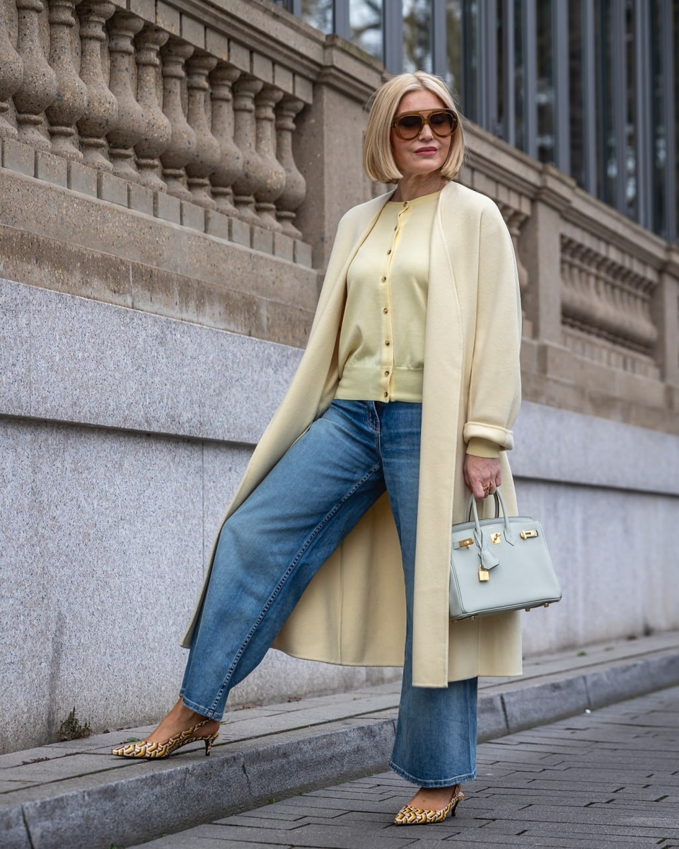 1. Элегантные джинсы: Зауженные к щиколоткам светло-синие джинсы становятся по-настоящему стильными в сочетании с бледно-желтым кардиганом на пуговицах. Дополните образ светлым пальто без воротника и выберите яркие остроносые туфли — и весенний лук готов!