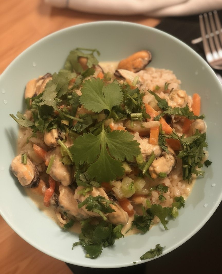 - Лук, нарезанный мелко, обжаривается на сковороде; после добавляются мидии, немного сливок (возможно, кокосовых) и любимые специи.