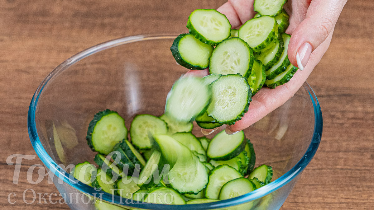 Шаг 1: Возьмите 4 свежих огурца, весом около 300 г, и нарежьте их тонкими кружочками. Переложите их в удобную миску.