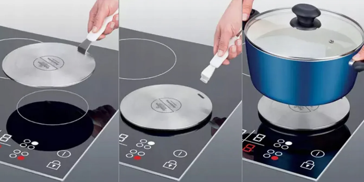 - Индукционный адаптер: это металлический диск, который кладется на конфорку и нагревается, передавая тепло кастрюле. Это удобное и экономичное решение, хотя скорость нагрева может быть ниже.