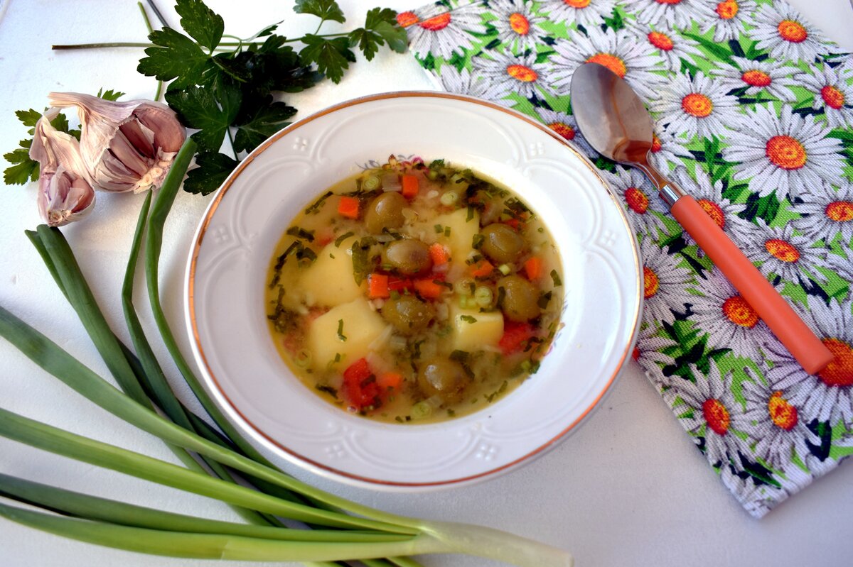 Когда картофель станет почти готов, обжаренные овощи и кусочки болгарского перца забрасывают в кастрюлю. Все ингредиенты нужно варить до готовности картофеля, после чего добавляют оливки вместе с рассолом, зелень и пропущенный через пресс чеснок. Последний шаг — довести суп до кипения и настоять под крышкой около получаса.