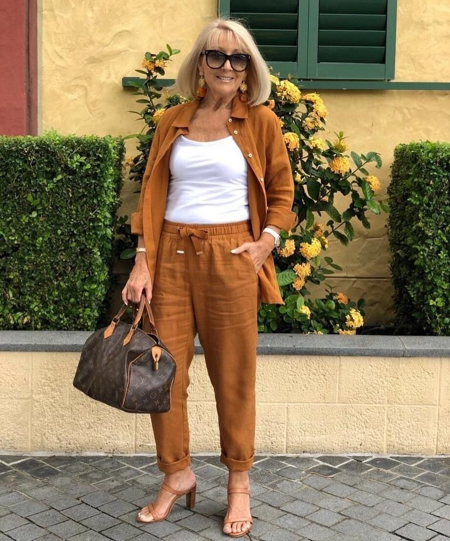 1. Льняной костюм кофейного оттенка: Зауженные брюки, завершающиеся на щиколотках, и длинная рубашка с рукавами до локтей создают идеальное сочетание стиля и комфорта. Такой наряд хорошо дополнится белым топом и сандалиями на устойчивом каблуке, что обеспечит образу свежесть и стиль.