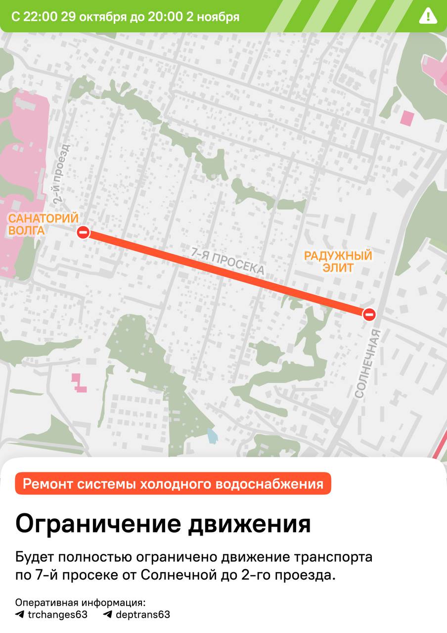 Причина - ремонт водопроводной линии холодного водоснабжения. Поэтому до 20:00 2 ноября Седьмую просеку на участке от улицы Солнечной до 2-го проезда Седьмой просеки полностью перекроют.