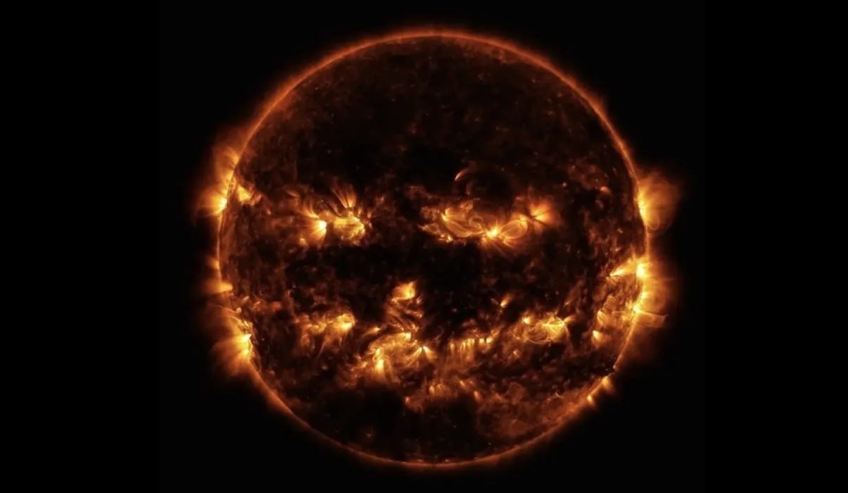 Жуть! В преддверии Хеллоуина солнце превратилось в зловещую тыкву. Пугающий снимок звезды сделал аппарат Solar Dynamics Observatory.