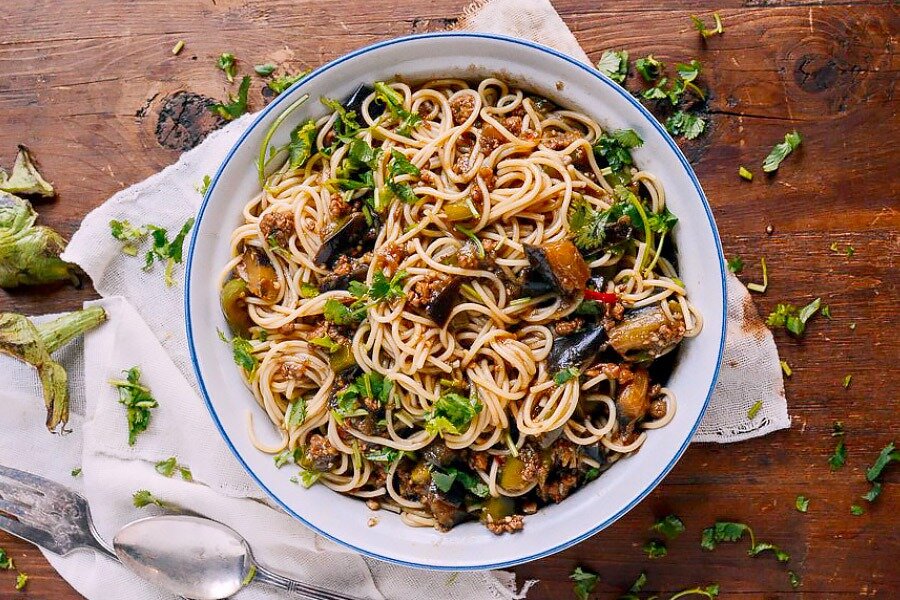 Баклажаны нарезать кубиками по 2 см, замочить в соленой воде на 15 минут. После этого слить воду и отжать овощи.В свиной фарш добавить шаосинское вино, 2 ч.л светлого соевого соуса, кунжутное масло, кукурузный крахмал и немного воды. Перемешать и оставить мариноваться.Болгарский перец нарезать, а имбирь и чеснок измельчить. Подготовить соус, смешав его ингредиенты отдельно.Отварить лапшу в соответствии с инструкциями на упаковке, затем охладить и добавить немного растительного масла.В глубокой сковороде нагреть растительное масло, обжарить сначала болгарский перец, а потом перейти к имбирю и чесноку. После появления аромата добавить чили и маринованный фарш.Когда свинина изменит цвет, добавить баклажаны и обжаривать еще несколько минут. Затем ввести подготовленный соус и тушить под крышкой.В завершение добавить болгарский перец и лапшу, тщательно перемешать и при необходимости довести до вкуса с помощью соли и специй. Подавая, украсить свежей кинзой.Это блюдо не только сытное, но и ароматное — сочетание свинины, баклажанов и пряностей удивит даже самых взыскательных гостей. По желанию, лапшу можно заменить на рис, создавая новый стиль подачи любимого угощения