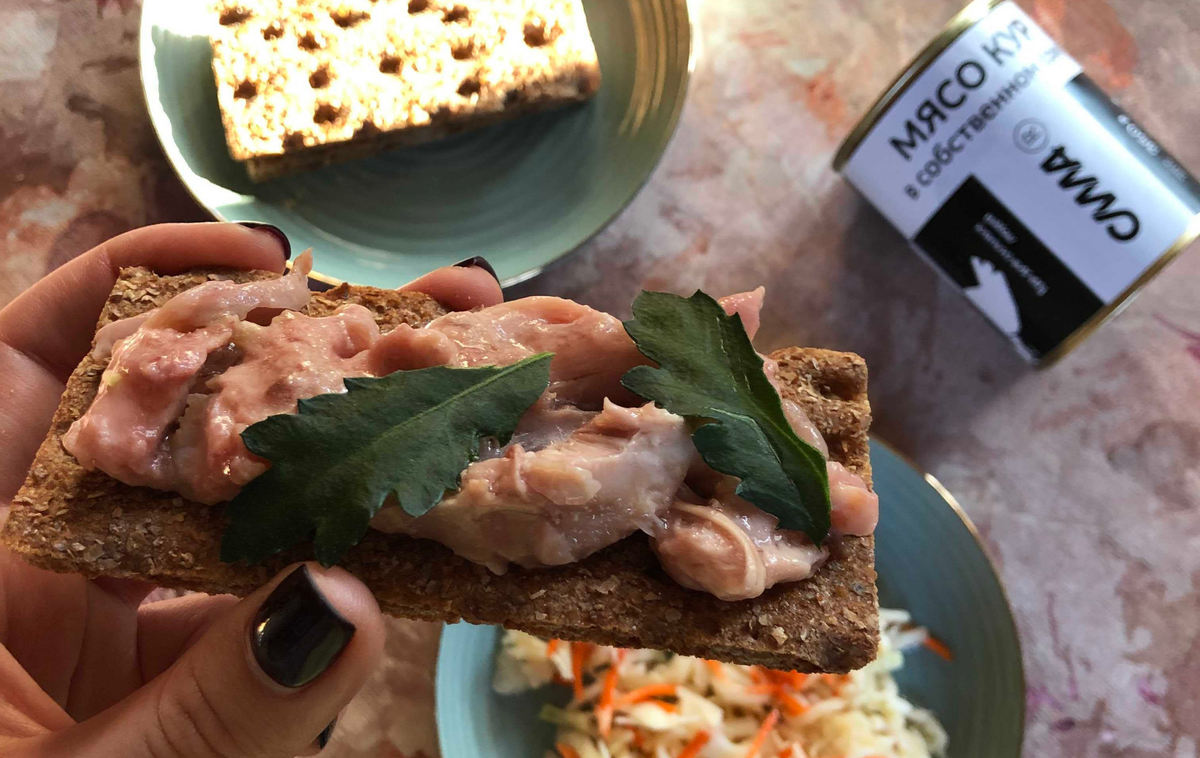 Приготовление очень простое: на хлебцы выложите куриную тушенку, добавьте зелень для яркости и свежести. Это не только вкусно, но и полезно, что особенно порадует гостей, придерживающихся диеты.