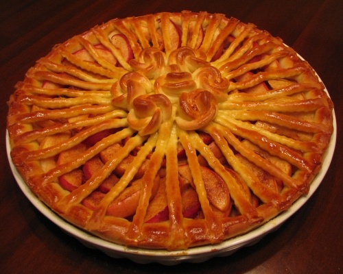 После укладки начинки, края теста смазываются яйцом, что создаст красивую золотистую корочку, а на поверхность выкладывается решетчатая корочка из теста. Пирог выпекается в предварительно разогретой духовке при температуре 180-200 °C до золотистого цвета и полной готовности яблок.