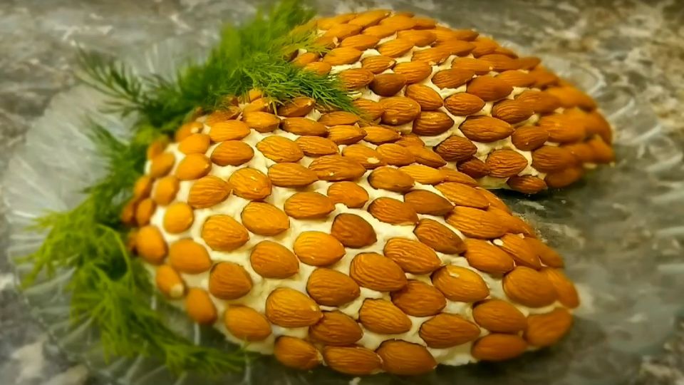Далее выложите салат на блюдо в виде шишки. Украсьте сверху миндалем, положите рядом еловые ветки и подавайте к столу, делится рецептом портал «Аймкук».