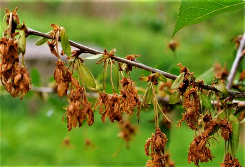 Монилиоз, или монилиальный ожог, вызывается грибком монилия. Поражённые растения выглядят угнетающе: на ветках возникают осыпающиеся и усохшие плоды, а также серые образования, содержащие споры. Разносимые весной насекомыми и ветром, споры грибка активируются в условиях повышенной влажности и температуры около 12-17°C — обычно во время цветения.