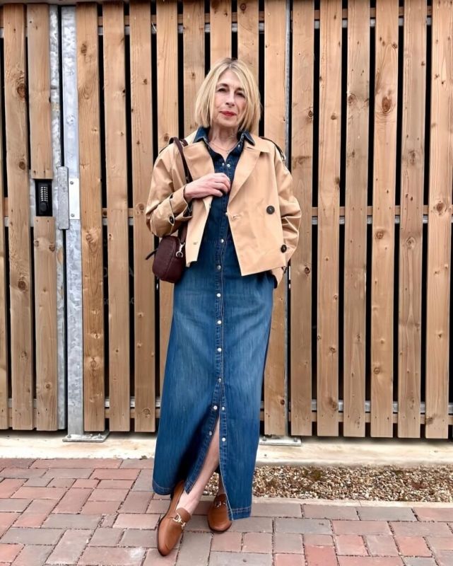 - Джинсовое платье макси прямого кроя, застёгивающееся на кнопки, станет отличной основой для повседневного лука. Чтобы добавить игривости, можно расстегнуть несколько кнопок, а для верхней части наряда идеально подойдёт бежевый укороченный плащ-тренч. Дополнить образ помогут коричневые лоферы и стильная сумочка через плечо.