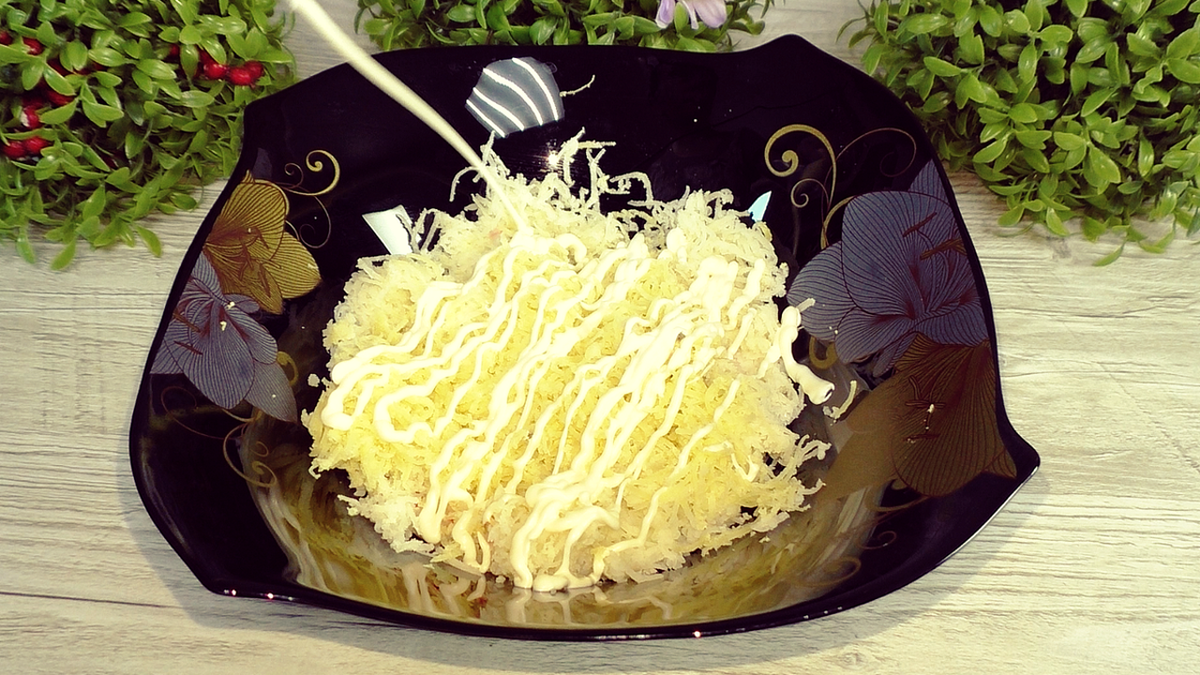 На дно салатника следует натереть картофель на мелкой терке, слегка посолить и сделать сеточку из майонеза. Это обеспечит не только вкус, но и красивую компоновку слоев. Далее укладывается нарезанное куриное филе, которое также можно слегка приправить перцем и майонезом.