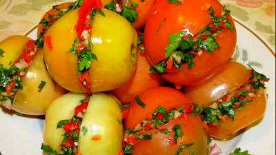 Каждый помидор следует разрезать, оставив неразрезанным низ, и начинить получившейся смесью. Это не только вносит яркие нотки в вкус, но и придаёт помидорам непревзойденный аромат.