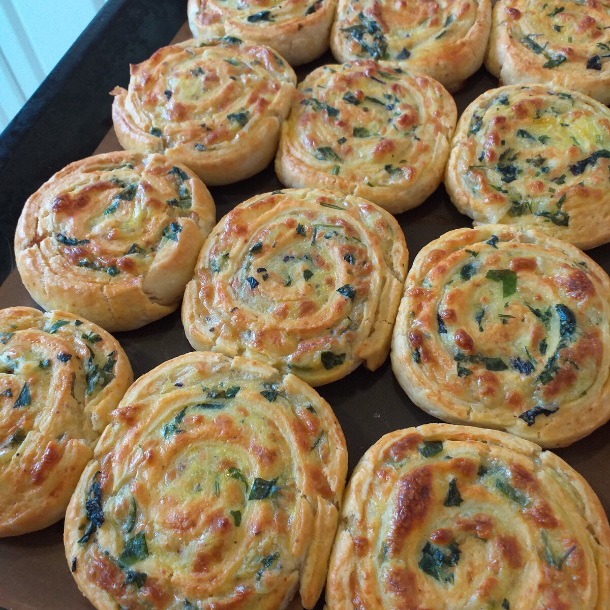 Приготовление этих завитков не отнимет много времени. Достаточно замесить тесто из муки, разрыхлителя, соли и масла. После этого следует добавить сливки и оставить его в холодильнике на 30 минут. Начинка из мелко нарезанной зелени и чеснока должна обжариться на сковороде до золотистого цвета, после чего смешивается с картофельным пюре и натертым сыром.