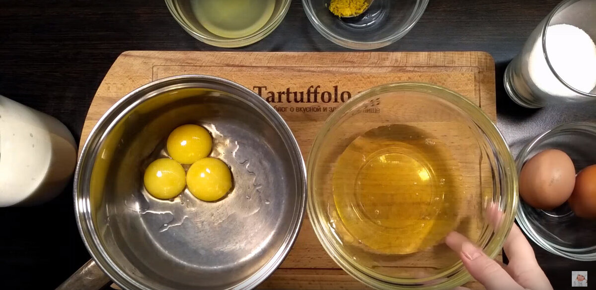Пока крем остывает, можно заняться белковым кремом. В отдельной миске взбиваются три белка с щепоткой соли до пиков. Параллельно варится сироп из 150 г сахара и 60 мл воды до состояния мягкого шарика — его нужно тестировать в холодной воде. Как только сироп готов, он вливается в взбитые белки, создавая воздушную массу.