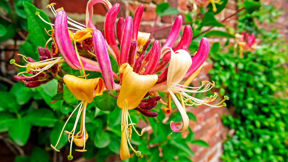 Эта лиана достигает высоты двух-трех метров и отлично подходит для обрамления заборов или беседок. Листья жимолости представляют собой интересные пары закругленных форм, а в верхней их части образуется симпатичное соцветие. Цветки распускаются в центре лета, радуя глаз своими кремовыми и розовыми лепестками, а к августу оживляют сад яркими оранжевыми ягодами — несъедобными, но красивыми.