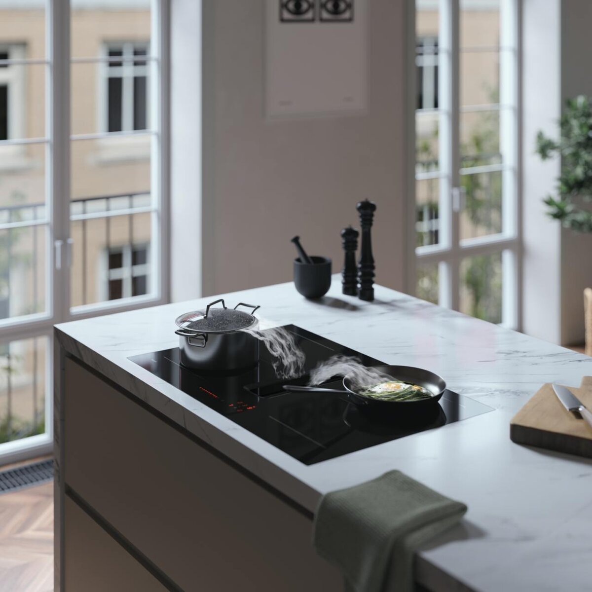 Варочные панели Asko с прямой встроенной вытяжкой предлагают уникальный подход к организации пространства. Установленная в центре индукционной поверхности, вытяжка позволяет освободить кухню от громоздких и мешающих решений. При активации она плавно поднимается вверх, не создавая дополнительных неудобств, и начинает свою работу на одном из пяти доступных уровней мощности. Пользователи могут выбирать между автоматическими и ручными режимами для очистки воздуха, что делает процесс готовки более простым и приятным.