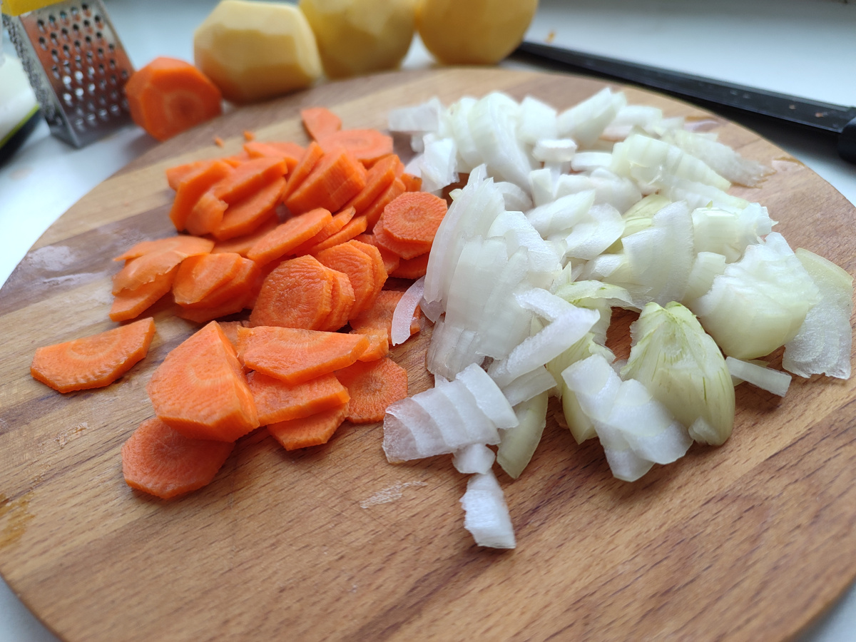 На начальном этапе необходимо нарезать лук и морковь. После этого в сковороду наливается вода и доводится до кипения, куда добавляются нарезанные овощи. Как только вода снова закипит, огонь следует уменьшить.