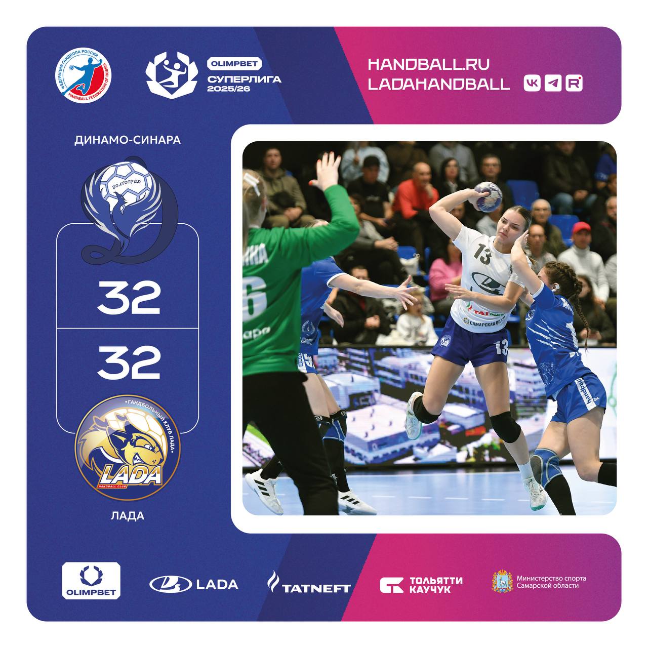 Матч «Динамо-Синара» - «Лада» завершился со счетом 32:32 (14:16).