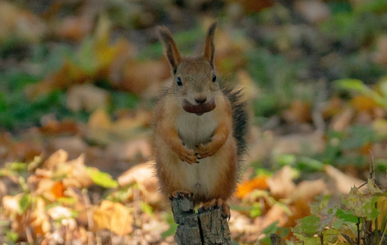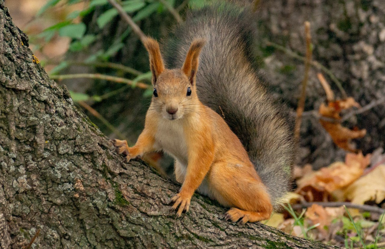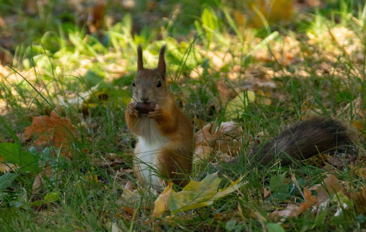 Озорная белка долго выбирала место, куда бы спрятать свои гастрономические богатства, и наконец, закопав в листву, довольная убежала.