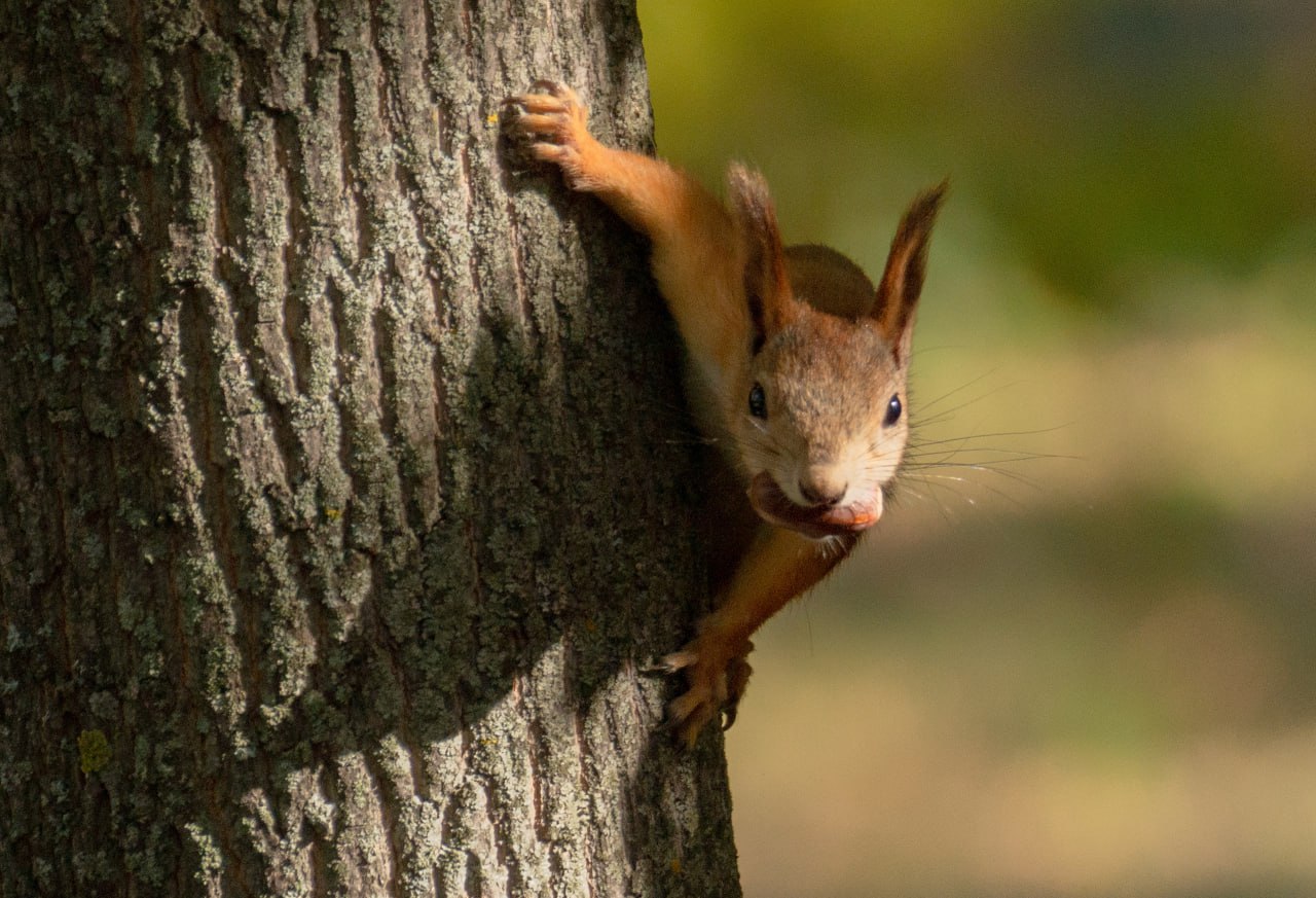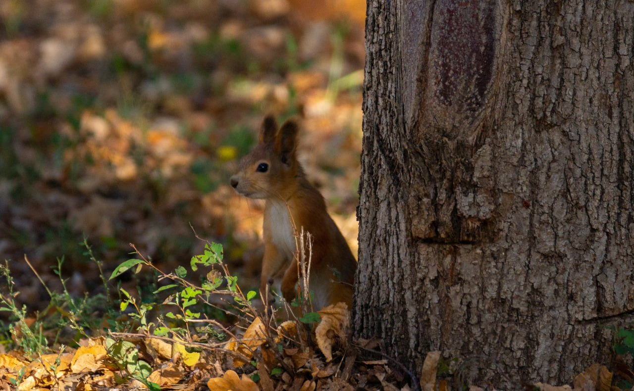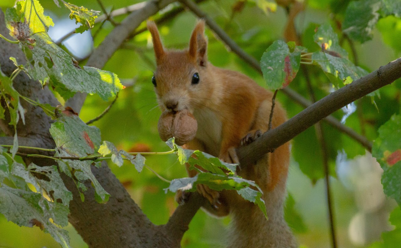 Озорная белка долго выбирала место, куда бы спрятать свои гастрономические богатства, и наконец, закопав в листву, довольная убежала.