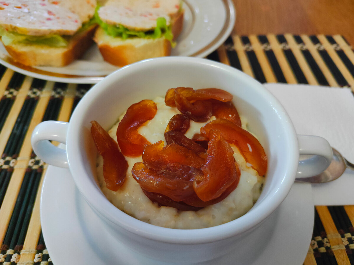 Начать день с питательного завтрака – залог хорошего настроения. Прекрасным вариантом станет овсяная каша, которую можно приготовить на воде и молоке в равных пропорциях. В качестве натурального подсластителя подойдут домашние яблочные цукаты. Вместе с кашей отлично подойдут бутерброды, щедро намазанные запечённой куриной колбасой. Этот вариант не только сытный, но и наполняет энергией на весь день.