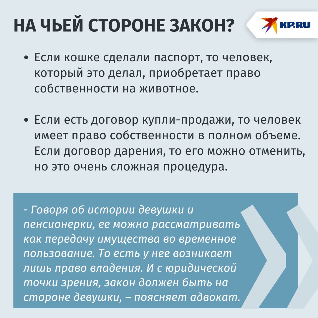 Такая ситуация произошла в Самаре. Оксана отдала кошку Асю пожилой женщине. Она объяснила, чем ее кормить, какие у нее привычки, на что стоит обращать внимание, и попросила присылать фото и видео, чтобы знать о самочувствие кошки. Но в скором времени бабушка перестала отвечать Оксане, закончив общение фразой «Извините, мне ваши советы не нужны». Оксана поехала к пенсионерке домой и, опасаясь за судьбу Аси, вызвала полицию, чтобы забрать кошку и убедиться, что с ней все в порядке.