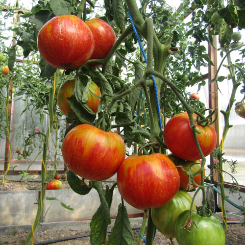 - Полосатый шоколад: Индетерминантный сорт с плоскоокруглыми плодами, который достаточно неплохо подходит для теплиц.