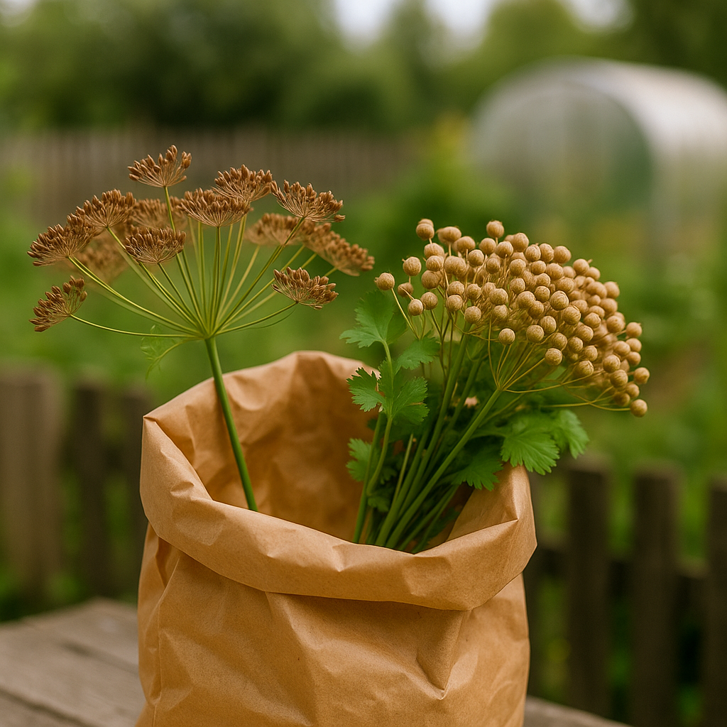 - Мешочки-ловушки: За несколько дней до сбора наденьте на зрелые зонтики органзовые или марлевые мешочки. Это поможет собрать все семена, как только они созреют.