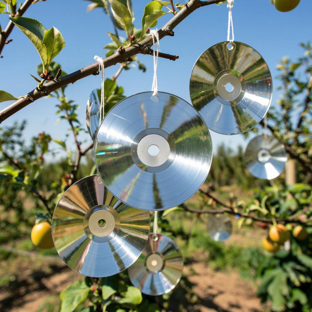 Для защиты отдельного дерева подойдет подвижный мобиль. Несколько дисков подвешивают на длинных нитях к одной центральной точке, которая фиксируется на самой высокой ветке. Таким образом, конструкция будет двигаться даже при слабом ветерке, создавая вокруг себя «зону оптического шума». Важно расположить отражатели по периметру кроны, чтобы перекрыть основные направления атаки с воздуха.