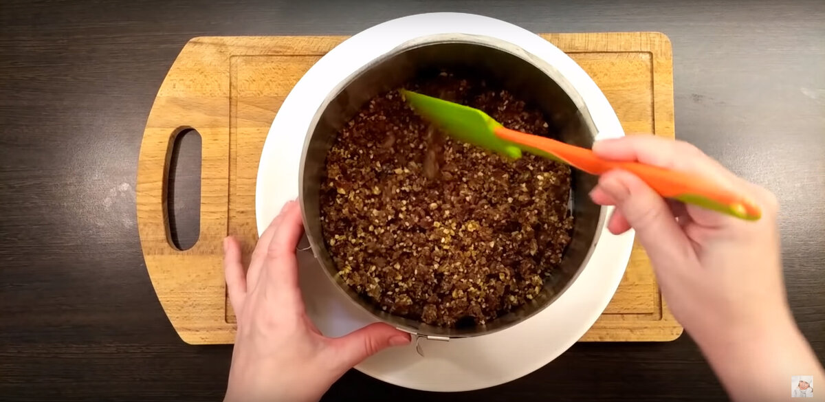 Орехи и финики следует измельчить в комбайне вместе с растопленным сливочным маслом до состояния однородной массы. Важно, чтобы масса была достаточно плотной для формирования основы. Приготовленный состав выкладывают в кулинарное кольцо, предварительно смазанное растительным маслом и обернутое пленкой. Утрамбовать массу нужно для создания равномерного слоя, после чего кольцо с основой помещают в холодильник для застывания.