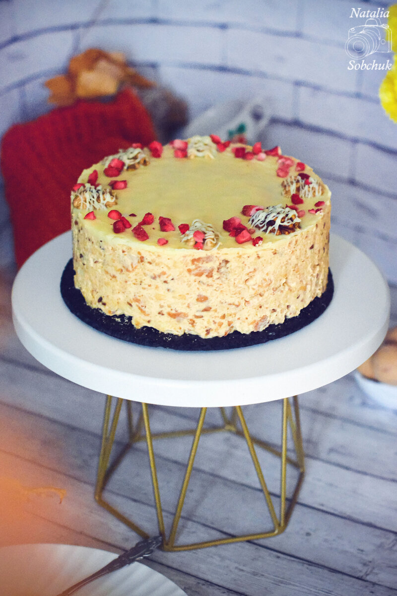 Разделите тесто на две части и натрите его на терке. Выпекайте коржи в предварительно разогретой до 180 градусов духовке в течение 20-25 минут, до золотистой корочки. После остывания, поломаем тесто на мелкие кусочки для последующей сборки торта.