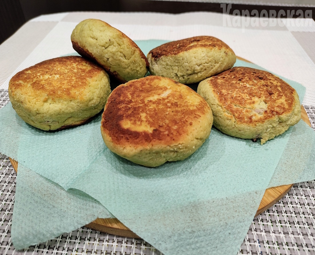 Готовить на сковороде с небольшим количеством масла под крышкой на медленном огне с обеих сторон до золотистой корочки.