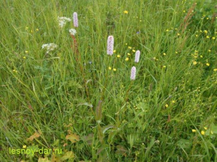 - Листья горца змеиного располагаются в прикорневой розетке и имеют продолговатую форму с характерными «крыльями» по краям черешка. Цветоносные побеги венчаются плотными колосовидными соцветиями, собравшими некрупные цветки различной окраски.