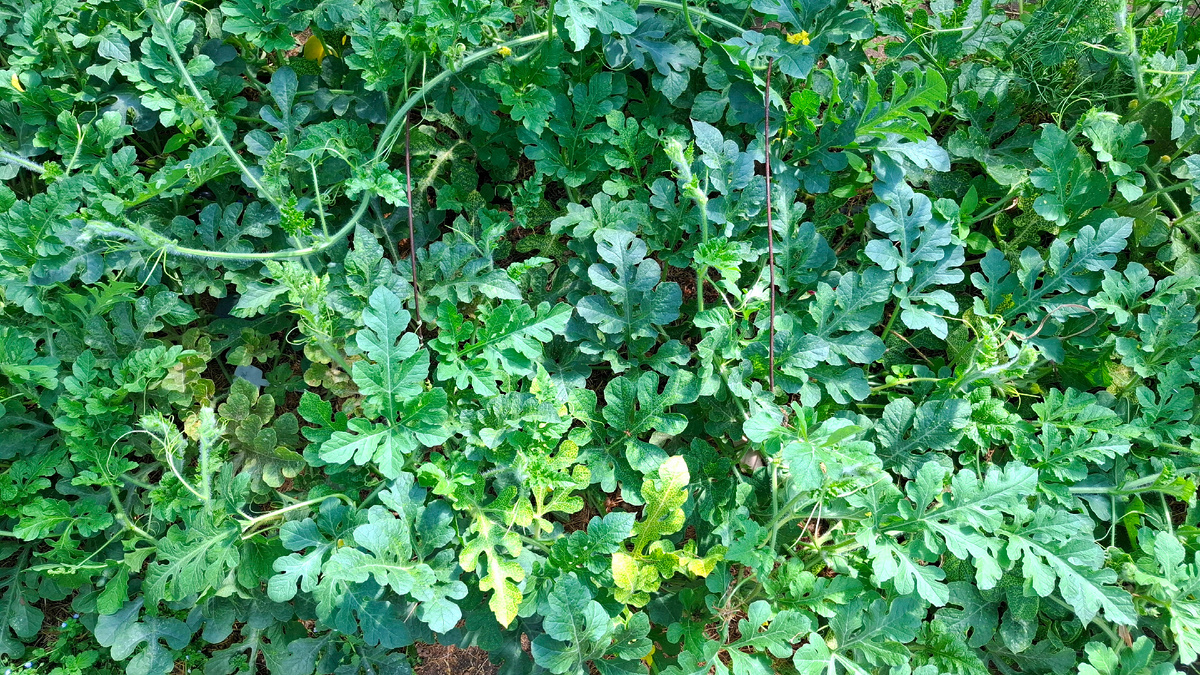 Интересно, что среди зеленой листвы можно найти целых три маленьких арбуза. Этот момент наводит на размышления: "Видишь суслика? - Нет. - А он есть!". Как же отрадно видеть результаты стараний, пусть они и не всегда на виду.