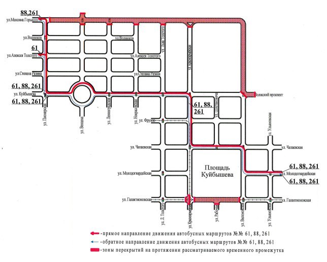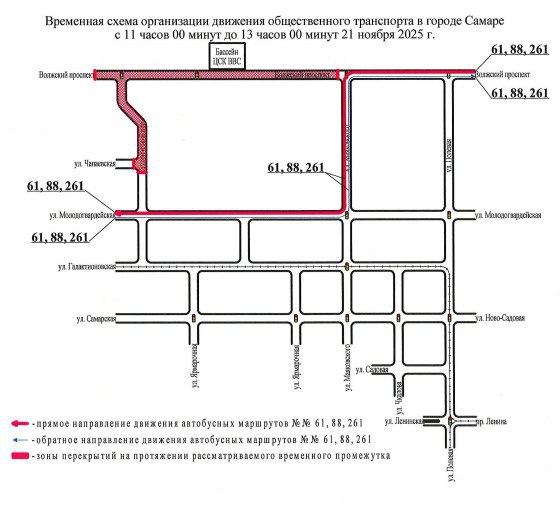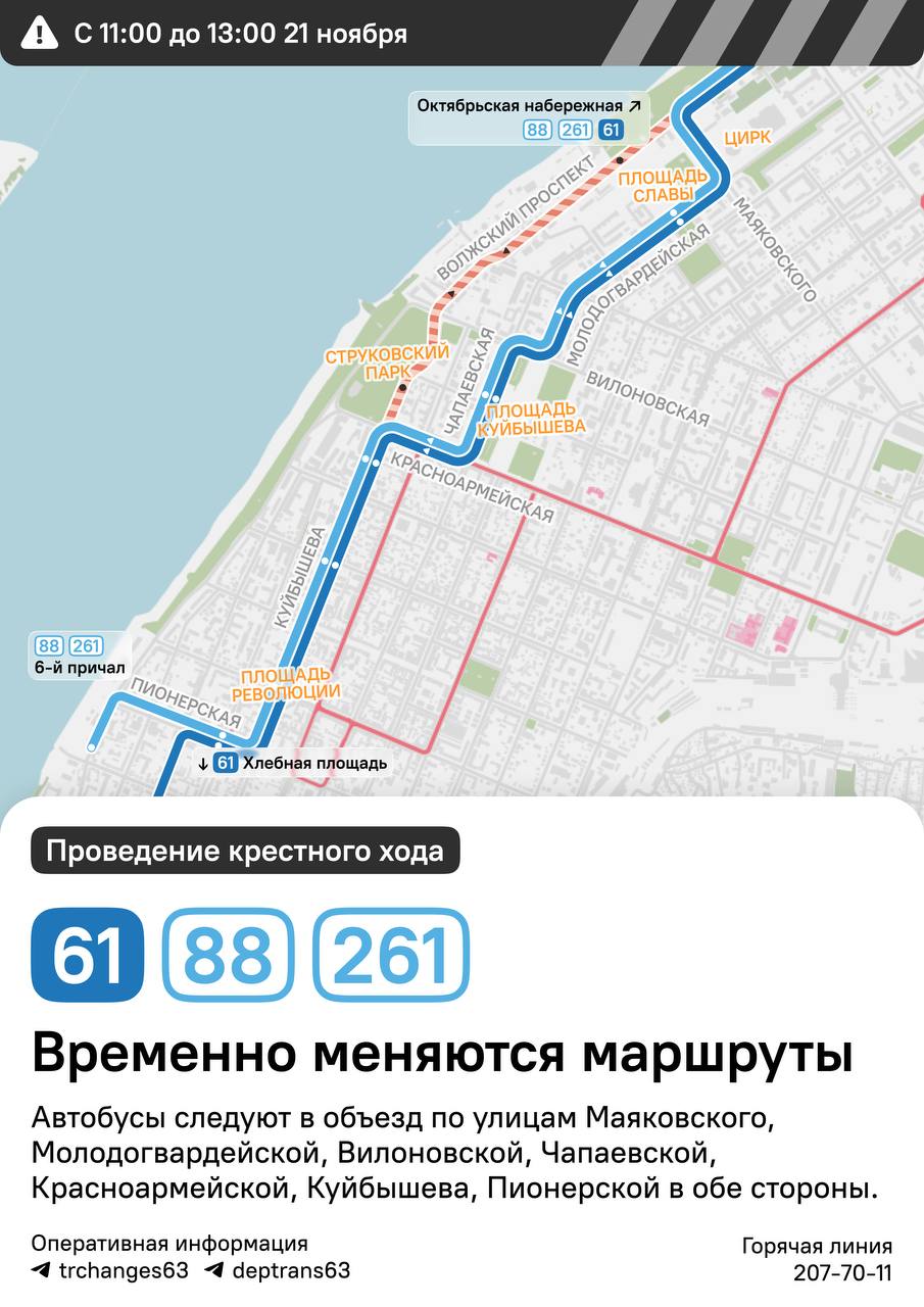 Обращаем внимание пассажиров городского общественного транспорта, что на период с 11:00 до 13:00 21 ноября будет приостановлена работа автобусного маршрута № 11 «Губернский рынок – Станция метро «Алабинская» и троллейбусного маршрута № 16 «Губернский рынок – 6-й причал». Автобусы №№ 61, 88, 261 проследуют по измененным трассам следования.