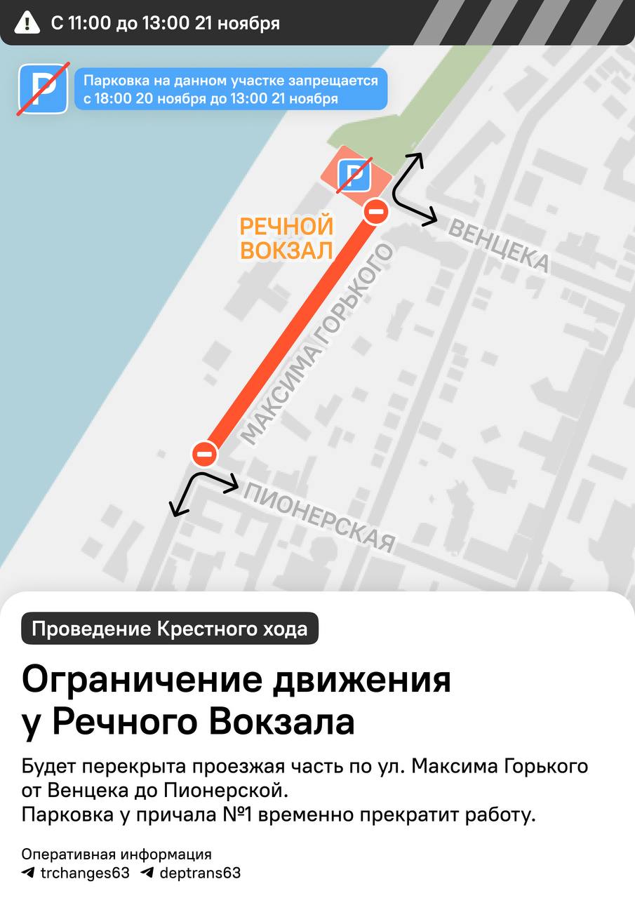 21 ноября в Самаре пройдет Крестный ход, посвященный Собору Архистратига Михаила и прочих Небесных Сил бесплотных. В связи с этим временно изменится схема организации движения в историческом центре города.