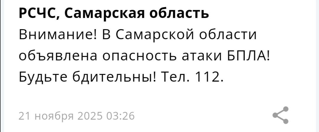 Сегодня ночью в Самарской области объявлена опасность атаки БПЛА!! Будьте бдительны!