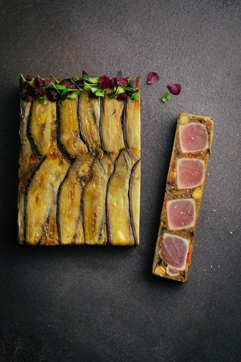 Теперь наступает момент, когда необходимы тонкие ломтики жареных баклажанов, обжаренных на фритюре или гриле. Готовые брусочки тунца также обжариваются на сковороде до золотистой корочки. Эти элементы аккуратно укладываются в форму для террина: сначала слой жареных баклажанов, затем брусочки рыбы, чередующиеся с баклажановой икрой.