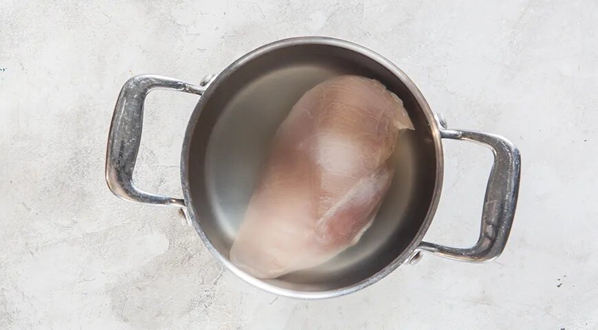 Сначала на кухне готовится куриная грудка. Её следует поместить в кастрюлю, залить 500 мл горячей воды и довести до кипения на сильном огне. Как только вода закипит, огонь нужно уменьшить. Сняв пену, добавить немного соли и оставить вариться на среднем огне на протяжении 25 минут. По завершении варки, грудку нужно вынуть из бульона и оставить остывать, а затем, когда она остынет, нарезать на аккуратные ломтики толщиной около 5 мм.