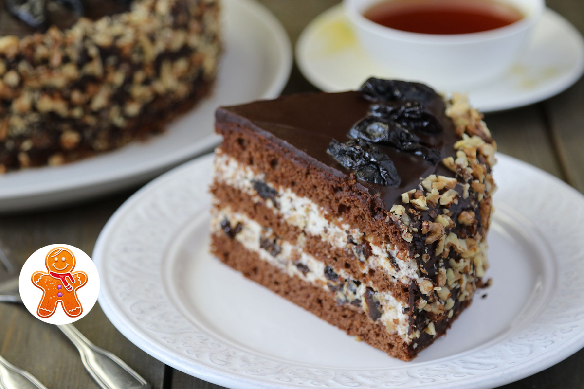 Собранный торт необходимо охладить в холодильнике на несколько часов, чтобы крем стабилизировался. После охлаждения торт покрывается шоколадной глазурью, обсыпается рублеными орехами и украшается черносливом, превращаясь в настоящую кулинарную шедевр!