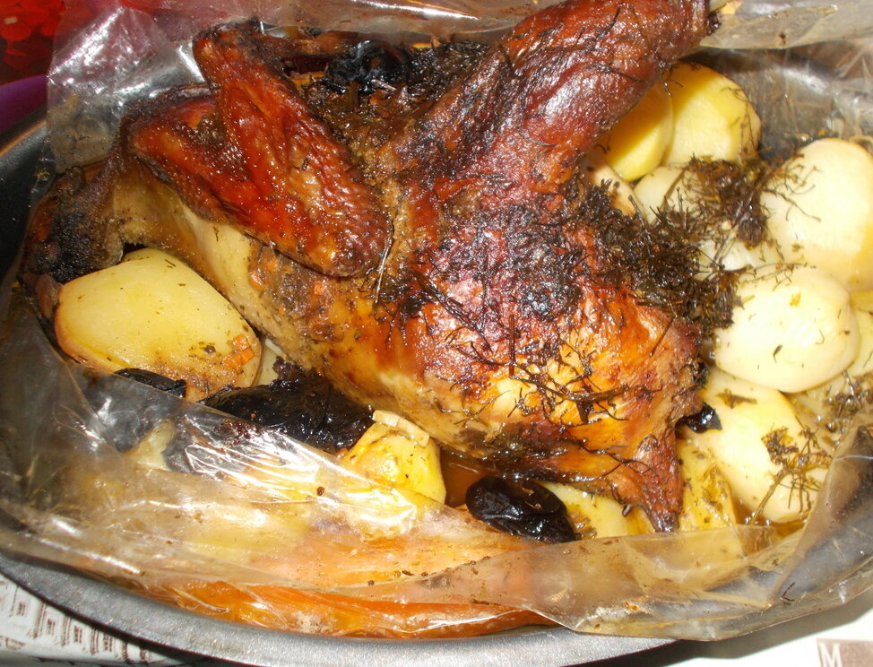 Сначала курицу обмазывают медом, предварительно разведённым небольшим количеством воды. Затем следует щедро посолить мясо и приправить его по вкусу любимыми специями. Курицу оставляют на час для маринования, чтобы она пропиталась ароматами. Внутрь тушки помещают чернослив и пару картофелин.
